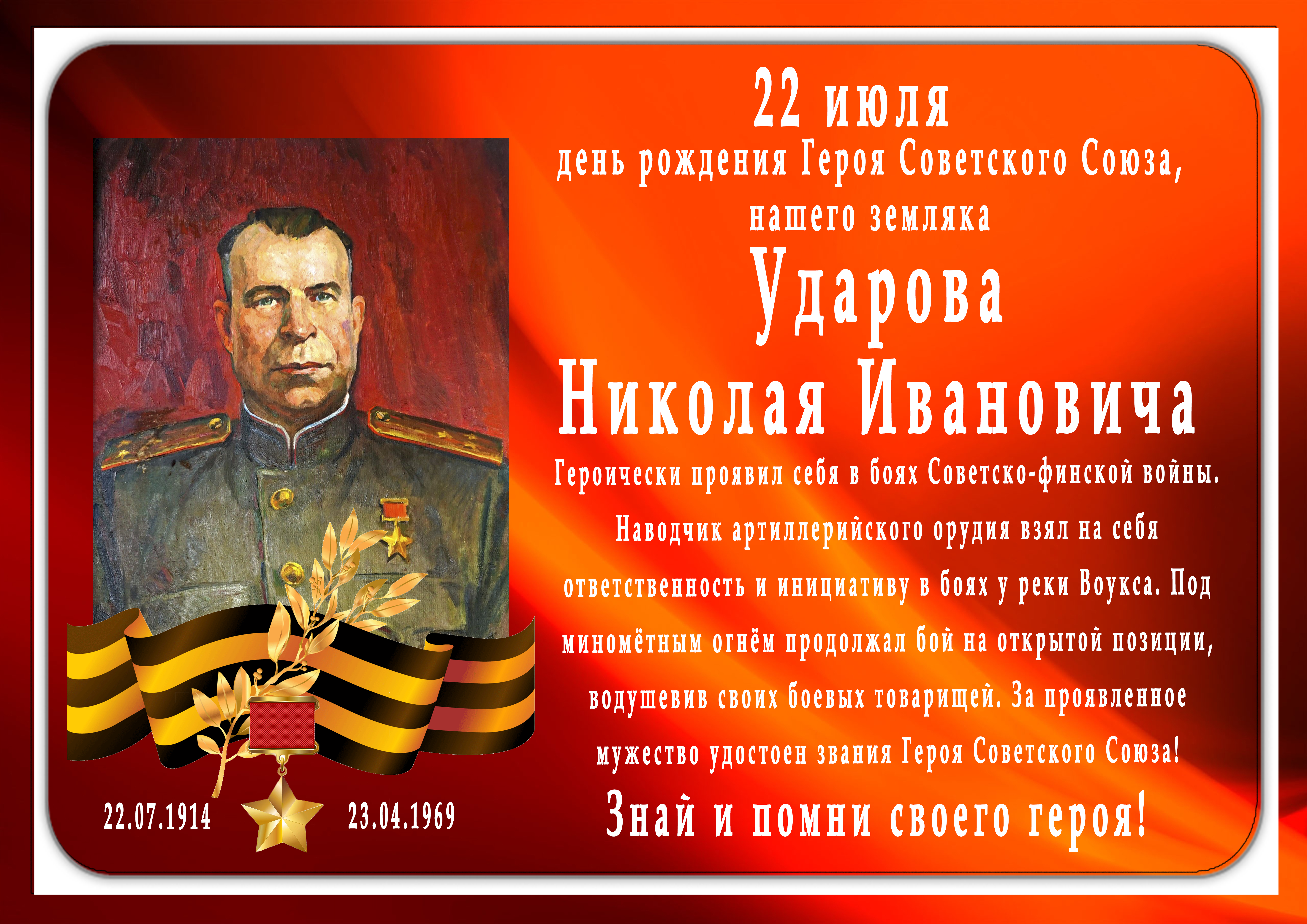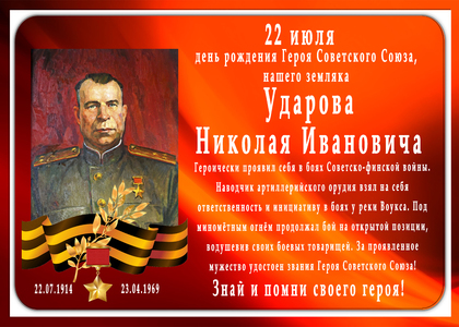 11 февраля 1940 года младший командир Николай Ударов отличился в боях в районе реки Пуннус-Йоки (Финляндия).