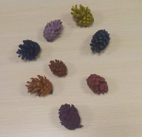 - Шишки надо сначала надо покрасить в разные цвета, используя кисточки и гуашь;