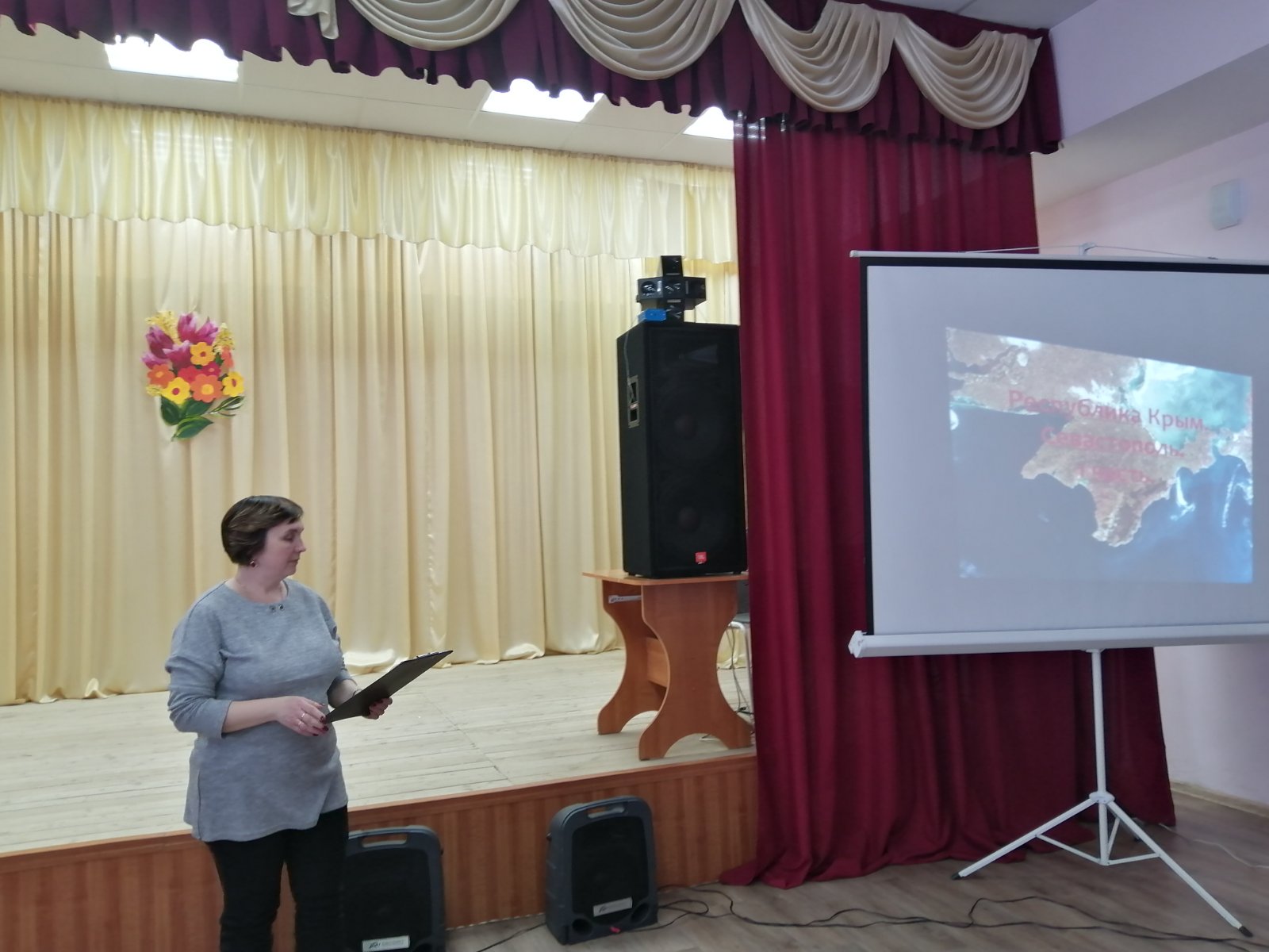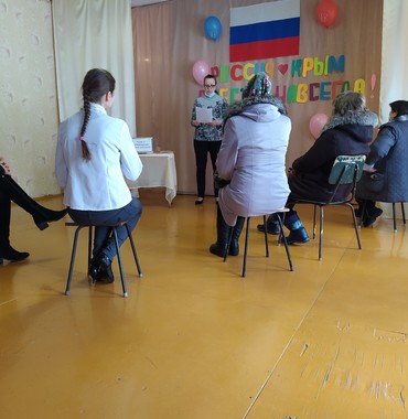 Мероприятие сопровождалось показом презентации «Крым – Россия - вместе навсегда». Методист СДК познакомила участников с историей, рассказала о важных событиях в истории республики; о народах, проживающих на крымской земле, о значении полуострова для России.